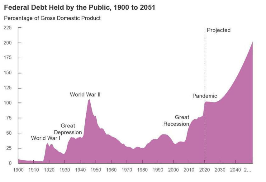 If current laws governing taxes and spending generally remained unchanged, federal debt held by the public would reach 107% of GDP in 2031 (surpassing its historical high) and would exceed 200% of GDP by 2051. https://t.co/MXB3mYLBnN