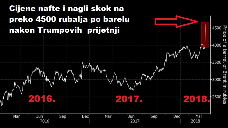 Na kraju smo došli u situaciju da su prijetnje američkog predsjednika Donalda Trumpa Kremlju da se “pripremi za raketne udare” u Siriji izazvao blagi pad ruske valute, ali je s druge strane doveo do povećane potražnje za naftom po prilično visokoj cijeni, ako uzmemo u obzir da je ruski proračun za 2018. pravljen s referentom cijenom nafte od 40 dolara po barelu tijekom cijele godine.