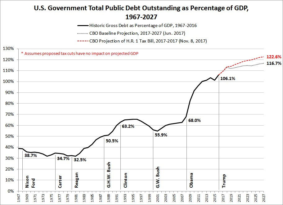 Umjesto toga, nakon završetka predsjedanja Billa Clintona, kada su SAD bilježile proračunski višak, razina duga je stalno rasla. Za vrijeme administracije Georgea W. Busha dug se povećao na 10 600 milijardi dolara, a pod Obamom na 19 000 milijardi dolara.