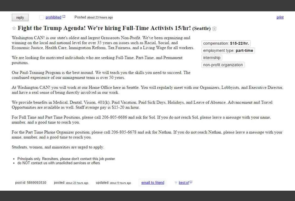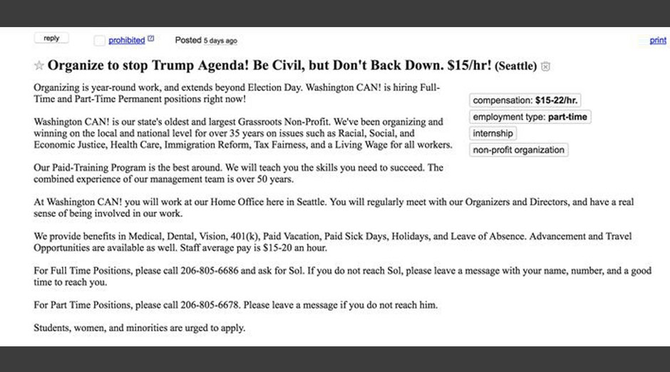 Nakon što je poznati američki konzervativac Sean Hannity progovorio o njemu, oglas za zapošljavanje plaćenih “progresivnih” aktivista u Seattleu je izazvao prezir, ali i prijetnje konzervativaca diljem Amerike. Nakon toga je stranica Craigslist uklonila oglas, ali se on kasnije opet pojavio, ali u nešto izmijenjenom obliku.