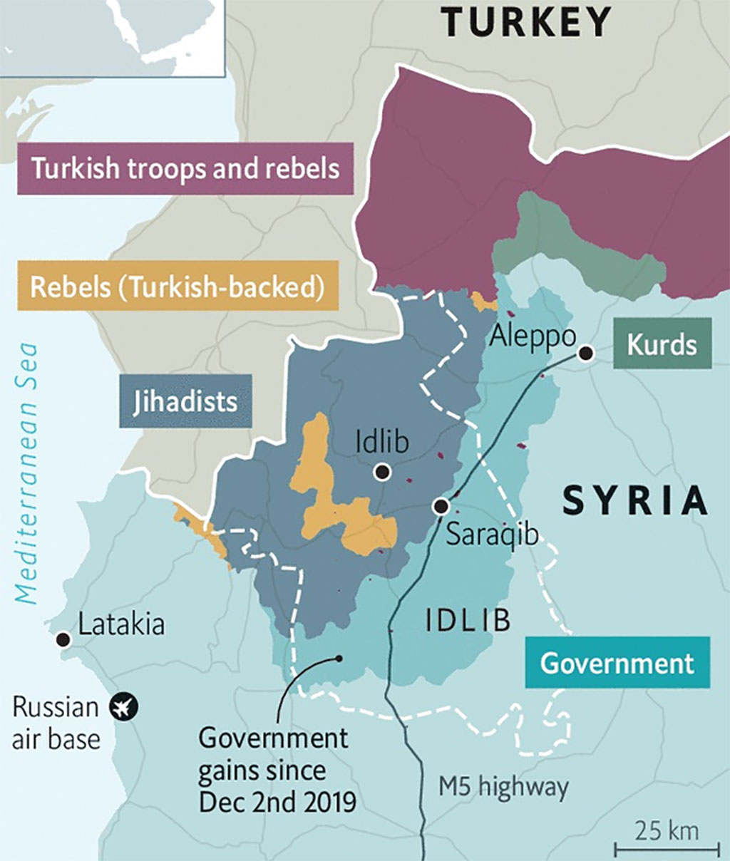 prema raspoređivanju turske vojske koja zadnjih dana ulazi u Idlib vidi se da se raspoređuju na katetama Efrin-Idlib-Ariha i Ariha-Jisr ash Shugur a granica s Turskom je hipotenuza i to je ta granica podjele Idliba u omjeru 40% proturski dio i 60% proassadovski dio, situacija nije ista kakva je bila na početku vojne akcije jer Erdogan ima u rezervi 5000 stranih islamista, 20000 proturskih pobunjenika na sjeveru Sirije i 100000 turskih vojnika a Assad zbog velikih gubitaka a posebno u zadnjim borbama s turskom vojskom sve više koristi regrute, policiju i lokalne plemenske milicije i bez pomoći ruske avijacije i IRGC-a i Hezbollaha nema nikakve šanse za zauzimanje idliba a za probijanje koridora M5 zaslužan je Hezbollah jer su se SAA bili povukli pred uraganskom vatrom turskih dronova, artiljerije i raketa zemlja-zemlja