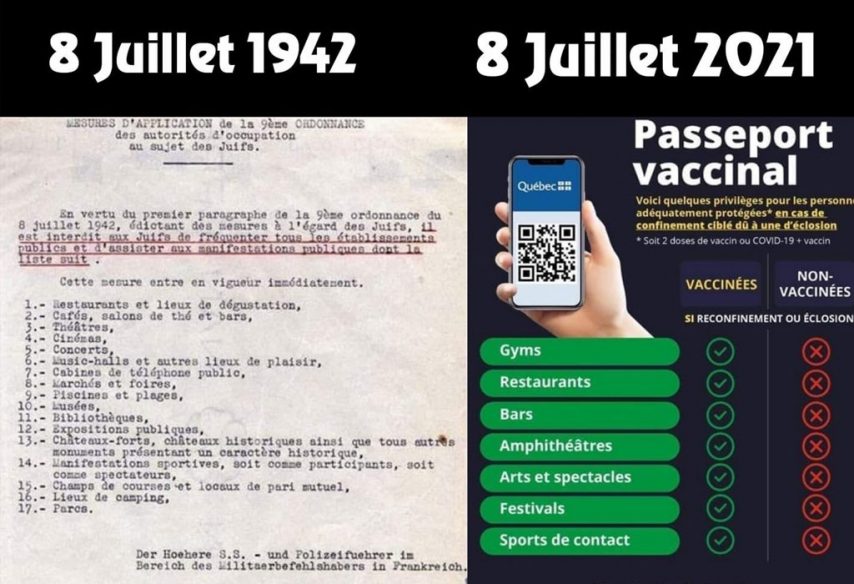 Daleke 1942. godine nacistička Francuska je, 8. jula naredila da Jevreji, ili njihovi potomci ne smeju da ulaze u: pozorišta, kafee, restorane, bioskope, vozove, tramvaje i td… Istog tog 8. jula ove 2021. godine, Makron je po naredbi svoje oligarhije doneo naredbu da niko ko nema QR cod vaccinalnog pasosha (pass sanitaire, koji Francuzi sada zovu pass nazitaire) ne sme da ide u: pozorišta, kafee, restorane, bioskope, vozove, tramvaje i td… U crnoj psihijatriji i u psihološkom ratu simbolika je izuzetno važna, jer se obraća i svesnom i nesvesnom delu naše ličnosti!