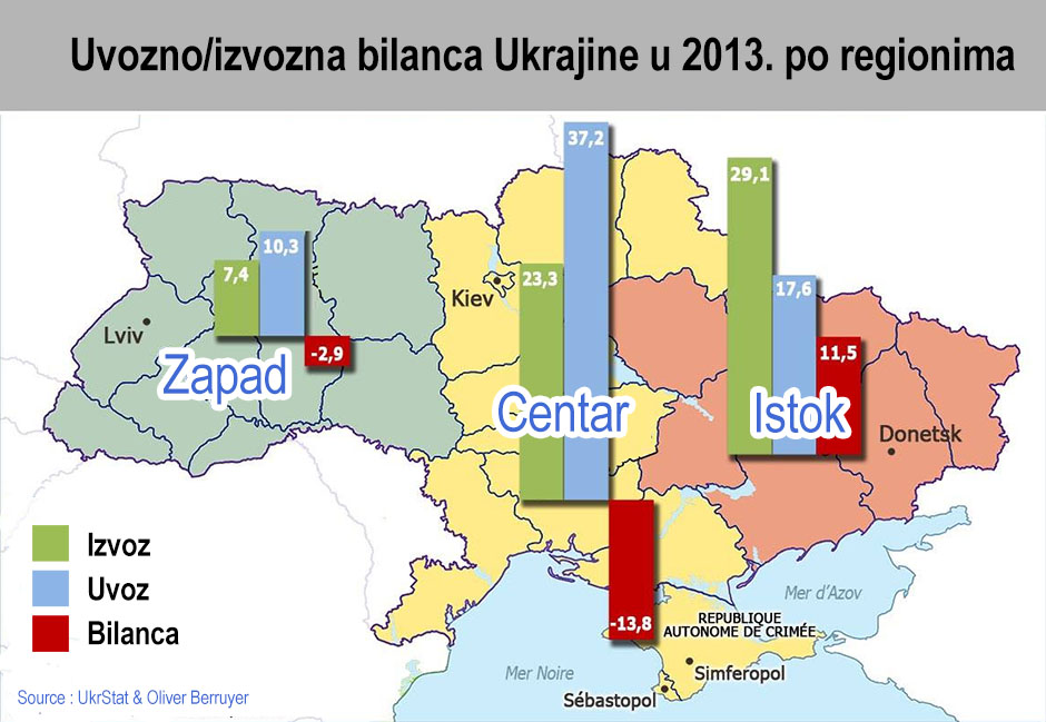 Karta dolje prikazuje trgovinsku razmjenu, odnosno uvoz, izvoz i trgovinski deficit i suficit prije takozvanog “EuroMaidana”, a brojke jasno govore da bez Donbasa Ukrajina nema budućnosti.