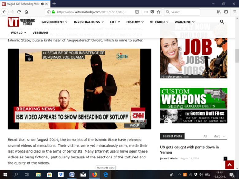 Portal dnevno.hr je 19. srpnja 2015. objavio tekst koji je ostao sasvim nezapažen u medijima: „SKANDAL SVJETSKIH RAZMJERA ZATAŠKAN: Snimka lažiranog i odglumljenog smaknuća ISIL-a pronađena u mobitelu američkog senatora!”