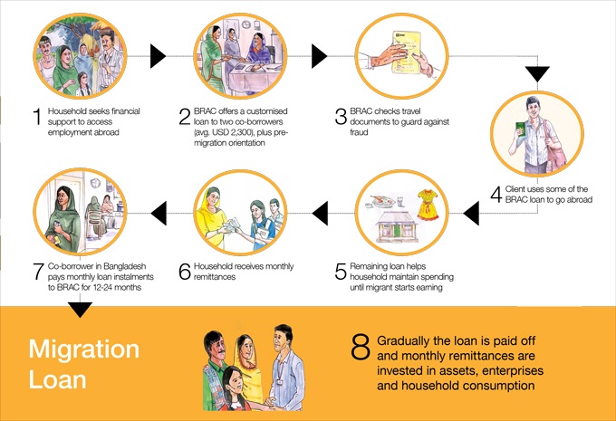 „Iako je to često vrijedna investicija, unaprijed plaćeni troškovi za odlazak u inozemstvo su znatni. BRAC nudi ljudima koji traže posao u inozemstvu kredite da emigriraju, a dizajniran su kako bi se zadovoljile potrebe za financiranjem radnika migranata na upravljiv i prikladan način. Program mikrofinanciranja provjerava i valjanost ugovora, te putnih isprava kako bi se osiguralo da kupci ne budu žrtve prevare neovlaštenih agenata“, piše na internetskoj stranici ove nevladine organizacije.