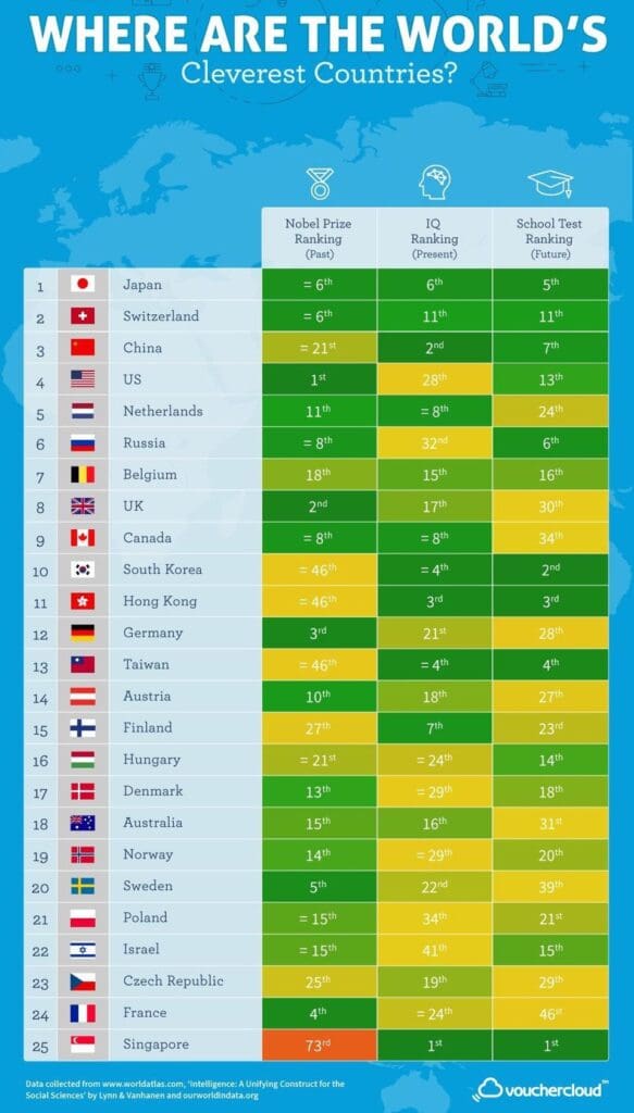 Naime, unatoč 25. mjestu na popisu, Singapur je na prvom mjestu u smislu kvocijenta inteligencije, ali i školskog uspjeha stanovništva. Međutim, na popisu zemalja s Nobelovim nagradama zauzima 73. mjesto.