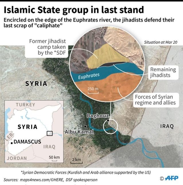 Situacija u Baghuzu izgleda mirna drugi dan zaredom, izjavio je novinar Reutersa u Baghuzu. Područje nadlijeću američki zrakoplovi i dronovi, a apokaliptične snimke kampa je mučno gledati. Leševi, među kojima ima boraca, civila, čak i djece, razbacani su posvuda. Živi tumaraju u smeću i među mrtvima, a djeca traže svoje roditelje. Žene koje se predaju novinarima govore kako ne zaslužuju takvu sudbinu nastavit će se boriti negdje drugdje.