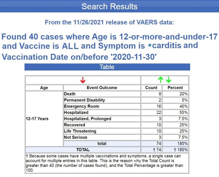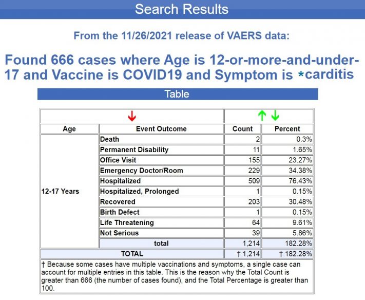 Proveo sam pretragu u VAERS-u, Sustavu za izvješćivanje o nuspojavama cjepiva vlade SAD-a, za sve slučajeve “karditisa” nakon cijepljenja COVID-19 za ovu dobnu skupinu, a od objave podataka VAERS-a od 26.11.2021., vratio sam rezultat od 666 slučajeva.
