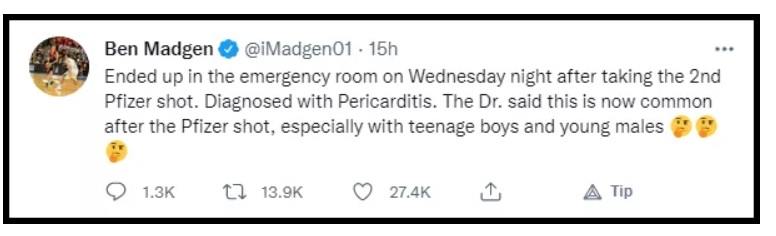 COVID World je nedavno izvijestio da je bivšem australskom profesionalnom košarkašu Benu Madgenu dijagnosticiran perikarditis (upala vrećice koja okružuje srce) ubrzo nakon što je primio drugu dozu Pfizerovog cjepiva protiv COVID-19.