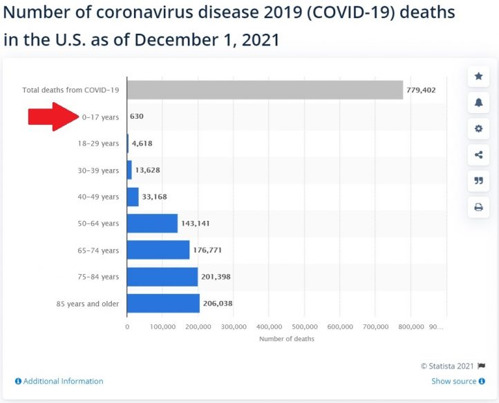 Od 01. prosinca 2021., od 779.402 navodna smrtna slučaja od COVID-19 koji pokrivaju gotovo 2 godine, samo 630 njih je bilo mlađe od 17 godina.