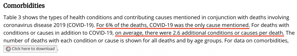 To se događa nakon što je CDC (Centar za kontrolu i prevenciju bolesti) potvrdio da samo 6 % smrtnih slučajeva povezanih s Covidom navodi Covid kao jedini uzrok, dok 94% navodi druge bolesti kao uzrok s prosječno 2,6 komorbiditeta. Drugim riječima, ako je netko bio u bolnici umirući od srčanih bolesti i sve je testirao na Covid kako bi ih odvojio u druge prostorije ili krila, Covid je bio označen na njihovom smrtnom listu. Savršen primjer za to je medicinska sestra s kojom je nedavno razgovarala Corey’s Digs koja je u svojoj bolnici imala četiri smrtna slučaja. Dvoje je bilo u hospicijskoj njezi, jedno je umrlo od karcinoma četvrte faze, a drugo je umrlo od završnog stupnja HOBP-a, ali za sve četvero je zabilježeno da imaju Covid, pa se te smrti dodaju u zbire koji se prenose javnosti, koji nisu mudriji. Što to čini sa stvarnom statistikom?