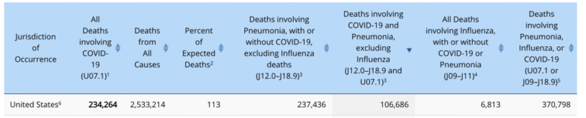 Evo još jednog primjera vrlo obmanjujuće tablice . Oni koriste izraz “Covid-19 kodirane smrti”, kada je zapravo samo 6 % uzrokovano isključivo Covidom, prema CDC-u, dok 94 % ima u prosjeku 2,6 komorbiditeta i dokumentirano je kao uzrok na smrtovnicama. Prema tome, samo oni koji su dokumentirani kao Covid kao uzrok smrti trebali bi se označavati plavom bojom. Zatim skupljaju gripu, Covid i upalu pluća zajedno kao “PIC” kako bi pokazali najviši marker na karti, crvenom bojom. Već znamo da je gripa čest uzrok upale pluća, te da je upala pluća dokumentirana u preko 45 % smrtnih slučajeva povezanih s Covidom.