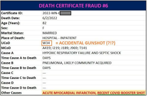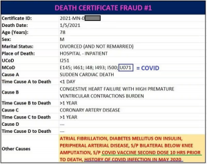 U jednom slučaju prijevare, CDC je naveo U071 (COVID) kao uzrok smrti, kada je u smrtovnici jasno navedeno da je druga doza cjepiva protiv Covida izazvala srčane komplikacije samo deset sati prije smrti. Umjesto da se pozabavi najneposrednijim dokazima, CDC je smrt šifrirao kao “COVID” – infekciju koja se prethodno riješila 7 mjeseci prije smrti.