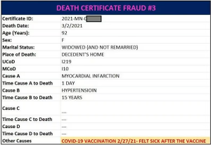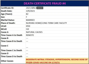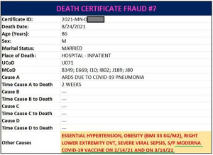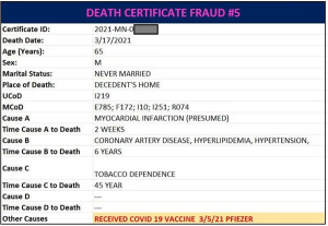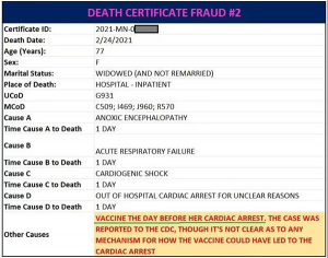 Ipak, bilo je mnogo slučajeva u kojima medicinski stručnjaci nisu mogli poreći da su cjepiva protiv covida-19 igrala ulogu u nečijoj smrti. U tim je slučajevima cjepivo protiv covida-19 navedeno kao uzrok smrti u smrtovnici. Međutim, kada je CDC primio smrtovnice, često su PRIKRIVALI ulogu cjepiva u uzroku smrti, kao što se vidi u nastavku. CDC je rutinski počinio prijevaru podataka odbijajući dodijeliti odgovarajući ICD kod za nuspojave cjepiva koji bi odgovarao uzroku smrti navedenom u smrtovnici.