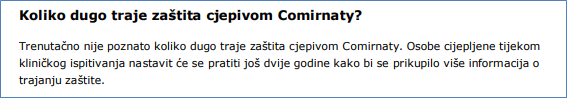 Iz dodatnog pregleda informacija o cjepivu u obliku pitanja i odgovora o trajanju zaštite BioNTech/Pfizer kaže: