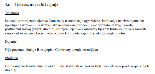 Dok mainstream mediji naviještaju o sigurnosti cjepiva tijekom trudnoće i dojenja pogled na uputu o lijeku kaže da se NE ZNA kako cjepivo djeluje na trudnice, trudnoću i dojenje!