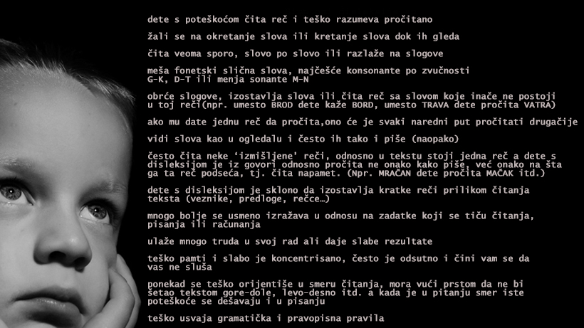 Dete ne mora posedovati svaki od ovih simptoma ali postojanje više njih, siguran je znak da se trebate obratiti defektologu za “prvu pomoć”. Takođe, važno je napomenuti da neke od ovih simptoma mogu imati i deca koja nemaju disleksiju već je to prosto prolazan stadijum u učenju i savladavanju veštine čitanja i pisanja. Razlika je u tome što se kod dece bez poremećaja ovakvi simptomi javljaju u ranijim godinama i prolaze, a kod disleksičara se zadržavaju. I dete sa npr. 9 godina može ispoljavati ovakve simptome, a to je već znak da se treba obratiti stručnjaku i da dete sigurno ima disleksiju, a pritom je potpuno psiho-fizički zdravo s normalni stepenom inteligencije ili čak natprosečno inteligentno.