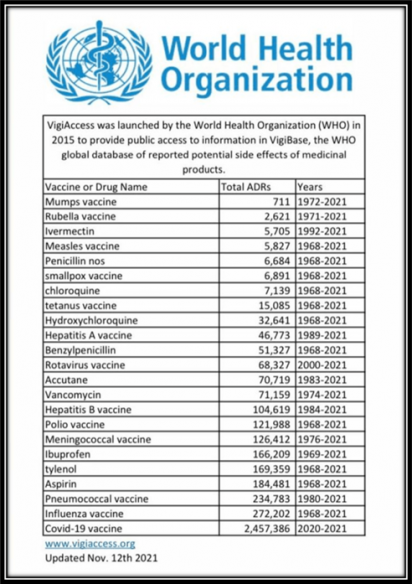 Liječnici koji pacijentima nisu ponudili informirani pristanak trebali bi u najmanju ruku izgubiti licencu pa čak ako se utvrdi odgovornost i krivično odgovarati. U posljednje vrijeme započinje pravna bitka. Sve to nažalost neće pomoći ozlijeđenima, još manje preminulima koji su prevareni ovim “cjepivom”. Prije no što damo neke od podataka spomenimo zabrinjavajuću činjenicu da su službeno registrirani štetni učinci COVID “cjepiva” (do 12. 11. 2021) veći od ukupno svih dosadašnjih cjepiva, što je jasno vidljivo iz priložene tablice Svjetske zdravstvene organizacije.