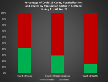 Public Health Scotland (PHS) objavljuje tjedno izvješće koje sadrži statistiku o slučajevima Covid-19, hospitalizacijama i smrtnim slučajevima prema statusu cijepljenja, od kojih je posljednje objavljeno u srijedu 8. prosinca. a sadrži podatke o negativnim slučajevima i hospitalizacijama te o umrlim između 30. listopada i 26. studenog ove godine. Posljednje potvrđuje da je u posljednja četiri tjedna bilo 76.677 slučajeva Covid-19, 1.735 hospitalizacija Covid-19 i 435 smrtnih slučajeva od Covida-19. Od toga je cijepljeno stanovništvo činilo 47.835 slučajeva (62 %), 1.226 hospitalizacija (71 %) i 371 smrtni slučaj (85 %), a to se može potvrditi čitanjem najnovijeg izvještaja.