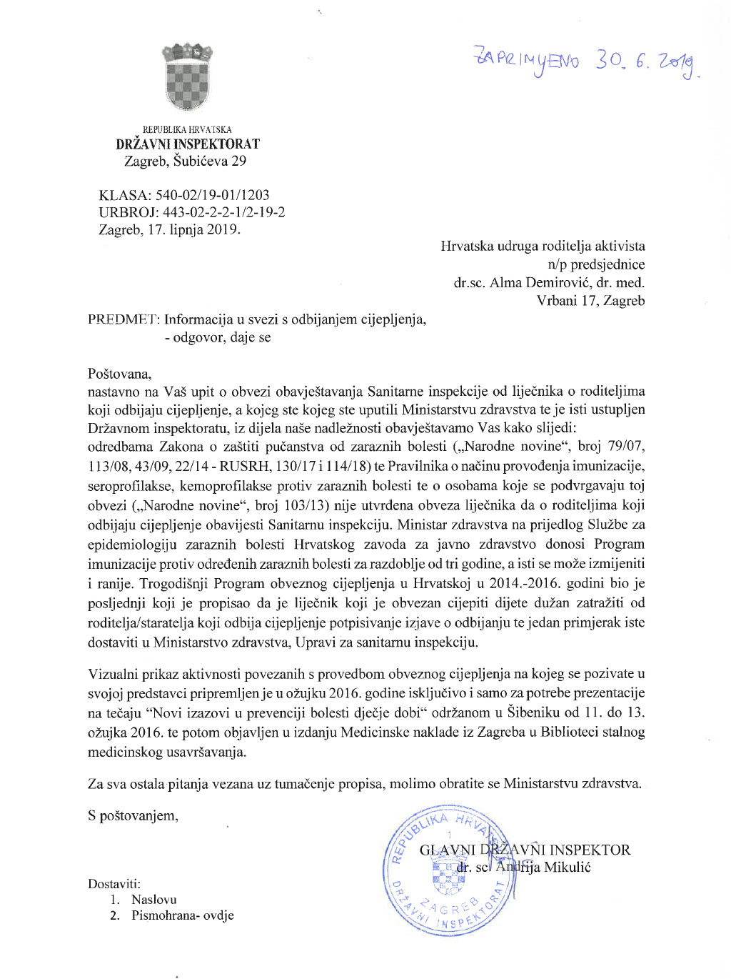 Potaknuti brojnim upitima roditelja koji su se javljali zbog prekršajnog postupka koji je pokrenut protiv njih obveznim prekršajnim nalogom Sanitarne inspekcije pri Ministarstvu zdravstva, sada pri Državnom inspektoratu, ishodovali smo i službeni dokument Državnog inspektorata kojim je također potvrđeno – sukladno pozitivnoj legislativi – kako ne postoji važeći zakonski propis koji podržava postupak u kojemu bi nadležni liječnik obavijestio Sanitarnu inspekciju o roditeljima koji nisu pristupili cijepljenju svoga djeteta.