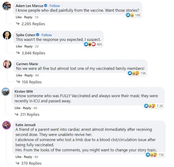 Ne znam jesu li takve priče dobili putem izravnih poruka, ali objava na njihovoj Facebook stranici, u vrijeme današnjeg objavljivanja, dobila je preko 182.000 komentara, a čini se da su to samo komentari onih koji su izgubili nekoga nakon što su primili injekciju COVID-a i komentari koji pitaju zašto ne pokrivaju tu priču.