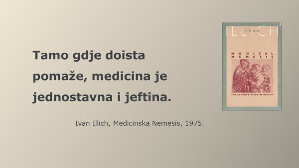 Konačno, ono što je posebno važno – treba prestati glorificirati medicinu kao najvažnije područje života. Ljude valja rasteretiti straha od bolesti i opsesivne brige za zdravlje. Zdravlje nije najveća vrijednost i cilj sam po sebi. Ono je samo sredstvo za postizanje drugih, važnijih ciljeva, individualnih i kolektivnih; samo jedan od uvjeta za smislen i svrhovit život. Parafraziram Ivana Illicha: Medicinsku potražnju treba energično reducirati. I time obesnažiti medicinsku neman. Vratiti suverenitet nad vlastitim tijelom. Odbaciti ovisnost o medicinskom autoritetu i monopol institucije da nam govori jesmo li bolesni ili zdravi i diktira zahvate u naše tijelo. Kondicionirajući nas za podložnost i ropstvo; onesposobljavajući za prave, istinske životne pothvate.