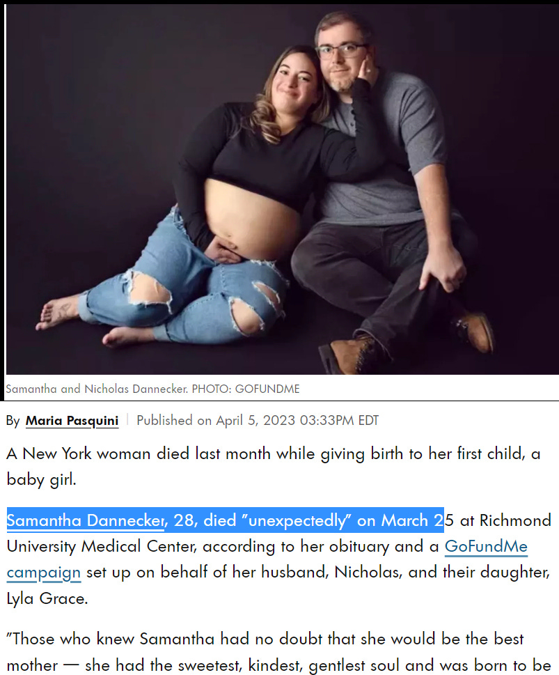 25. ožujka 2023. – New York, 28-godišnja Samantha Dannecker umrla je neočekivano dok je rađala svoje prvo dijete, djevojčicu.