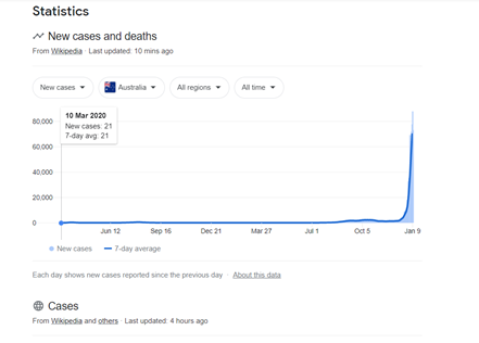 Victoria je bila na vrhu NSW-a prvi put nakon nekoliko tjedana jer je državno samoprijavljivanje rezultata brzog testa na antigen (RAT) objavljeno na internetu, premašivši granicu od 50.000. NSW, bez brojanja RAT-a, pogodio je 45.000 službenih slučajeva.