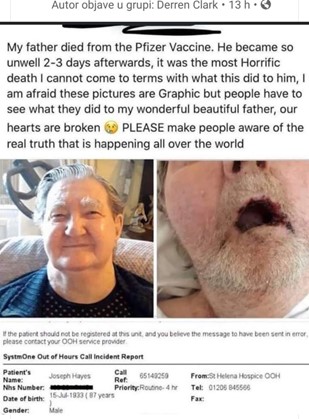 Joseph Hayes, jako se razbolio 2-3 dana nakon Pfizerovog cjepiva, i prema tvrdnjama njegovog sina, umro je u teškim mukama. Njegov sin je direktno okrivio cjepivo.