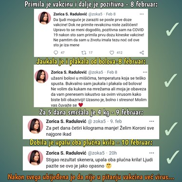 A do koje mjere ljudi imaju problema sa logikom i povezivanjem činjenica, odlično govori i ovaj primjer, srpske novinarke Zorice Radulović. Teško se razboljela odmah nakon cijepljenja, kaže imala je najtežu noć u životu, plakala od bolova, dobila upalu oba plućna krila, izgubila 4kg, i na kraju za sve okrivila – koronu!