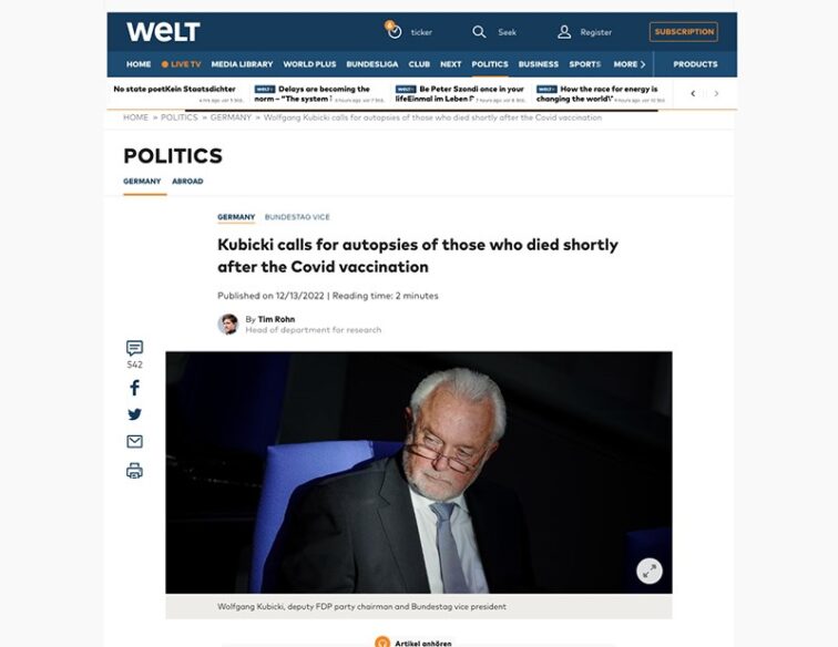 Die Welt izvještava da se potpredsjednik parlamenta, izabran na dužnost 2017. i ponovno izabran 2021., pozvao na studiju koju je proveo Peter Schirmacher, glavni patolog na Sveučilišnoj klinici Heidelberg, u kojoj su istraživači otkrili u 30 posto ispitanih smrtnih slučajeva nakon cijepljenja “da je cijepljenje uzrok smrti”.