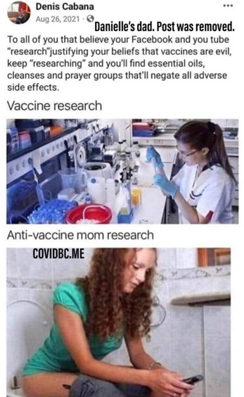 “Svima vama koji vjerujete svojim “istraživanjima” na Facebooku i Youtubeu koja opravdavaju vaša uvjerenja da su cjepiva zla, nastavite s “istraživanjem” i pronaći ćete eterična ulja, sredstva za čišćenje i molitvene grupe koje će poništiti sve neželjene nuspojave,” navodno je napisao Denis.