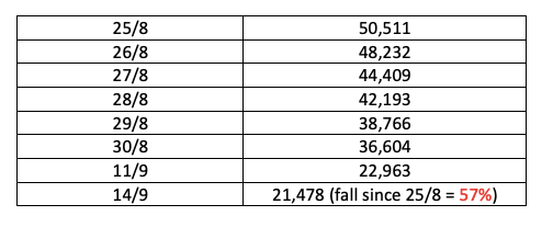 Da nastavimo brojke navedene u posljednjem postu na ovoj web stranici, pad cijepljenja u Velikoj Britaniji nastavlja uzrokovati veliki pad broja oboljelih od COVID-a.