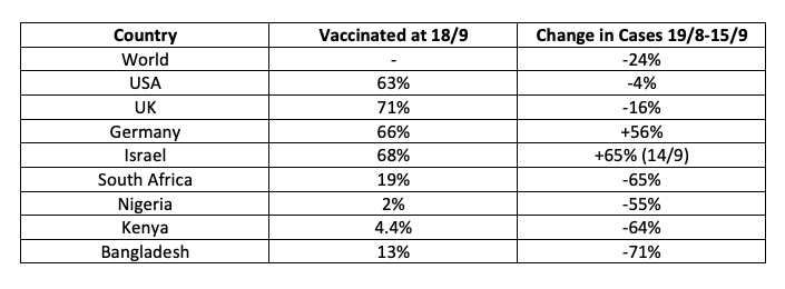 Smanjenje u Velikoj Britaniji za 16 % tijekom tog razdoblja posljedica je (kako je predviđalo Freenations) smanjenja cijepljenja koje se dogodilo s padom od 57 % između 25. kolovoza i 14. rujna. No taj se pad ne može usporediti s vrlo velikim padom slučajeva u najniže cijepljenim zemljama Južne Afrike, Nigerije, Kenije i Bangladeša.