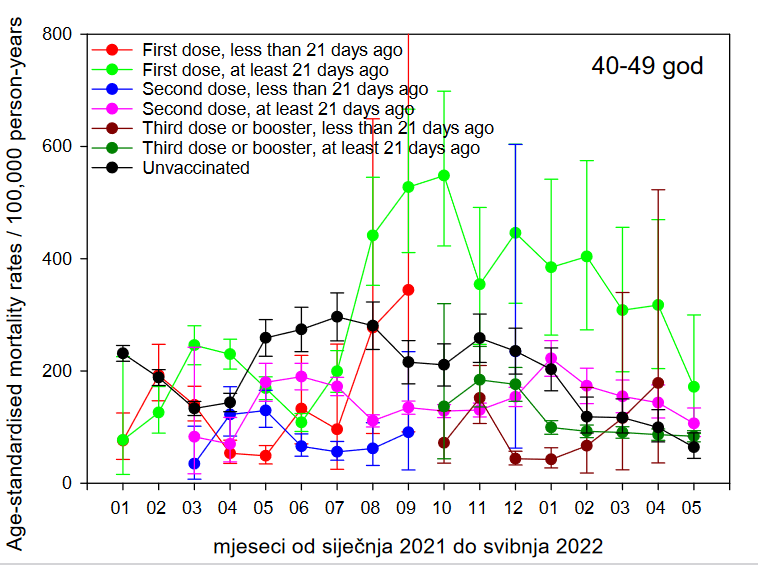 Već u svibnju 2021. smrtnost prve doze 21+, u studenom 2021. smrtnost druga doza 21+, a u veljači 2022. smrtnost treća doza 21- značajno je veća od stope smrtnosti necijepljenih.