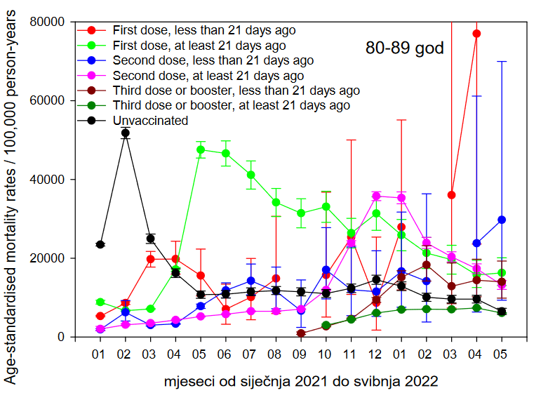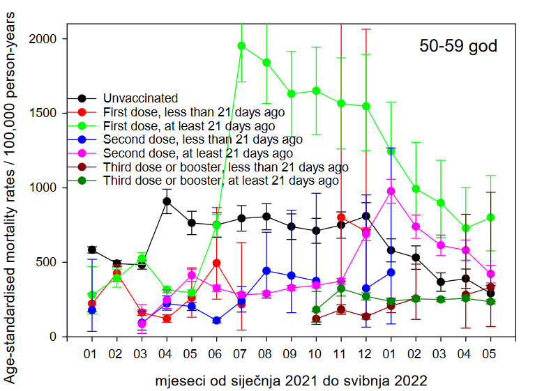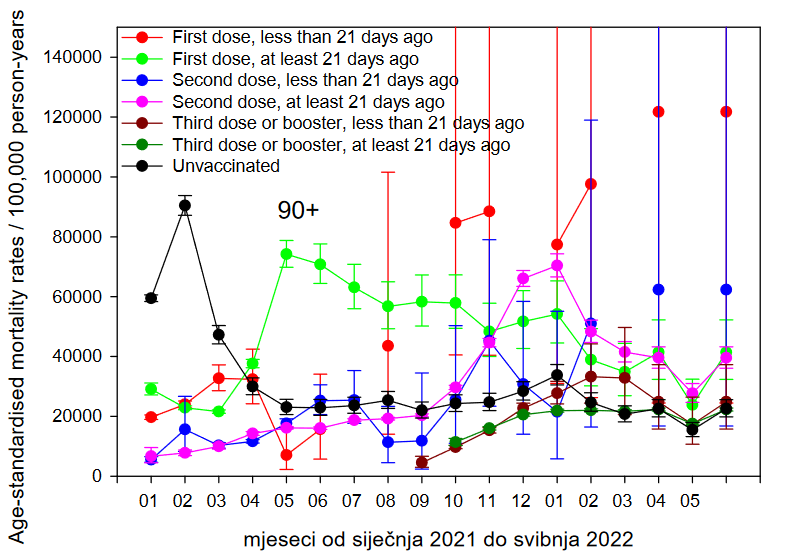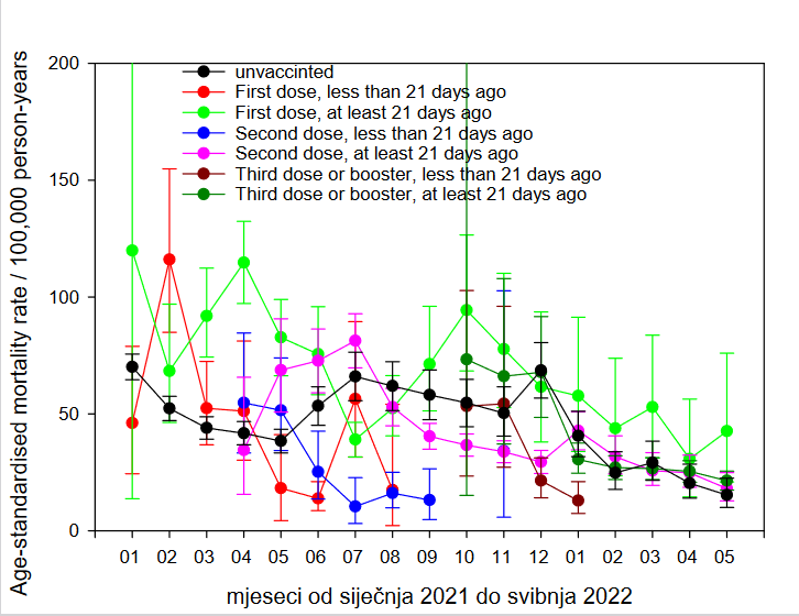 U svibnju 2021. smrtnost prve doze 21+, a u listopadu 2021 smrtnost druga doza 21+ postaje značajno veća od stope smrtnosti necijepljenih i ostaje do svibnja 2022.