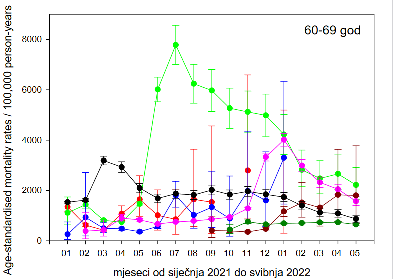 Očekujemo da se veća smrtnost u odnosu na necijepljene pokaže prije u odnosu na dobnu grupu 60-69 godina i to za sve cijepne statuse. Vidimo da je već u svibnju 2021. smrtnost prve doze 21+, u studenom 2021. smrtnost druga doza 21+, a u ožujku 2022 .smrtnost treća doza 21- značajno veća od stope smrtnosti necijepljenih. Možemo primijetiti da je u lipnju 2021. stopa smrtnosti prve doze 21+ šest puta veća od stope smrtnosti necijepljenih.
