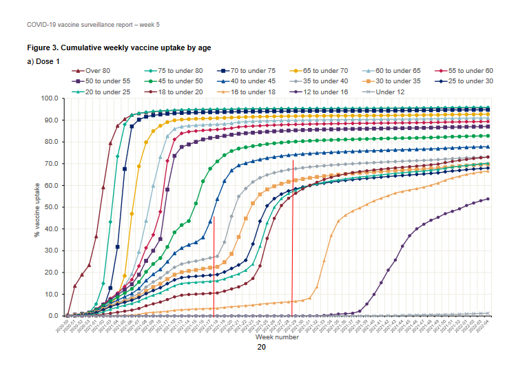 Na grafu možemo vidjet da u 18. tjednu tj. baš na kraju travnja i početku svibnja počinje najbrži rast u postotku primitka cjepiva u dobnoj grupi od 35-40 godina, koji zatim slijedi i kod mlađe dobne grupe da bi se taj najbrži rast u dobnoj grupi od 20-18 godina završio u 29. tjednu, tj. kada je već prošao lipanj. U objašnjenju artefakta ONS-ove metode dao sam primjer gdje se u mjesec dana procijepilo 30% populacije te je to uzrokovalo da mjesečna stopa smrtnosti bude više od 2 puta veća u necijepljenoj u odnosu na cijepljenu grupu iako su dnevne smrtnosti bile jednake. Vidimo da se od 18. do 23. tjedna u dobnoj grupi postotak cijepljenih povisio sa 27% na 60% tj. za više od 30%, a da se mjesečna stopa smrtnosti cijepljenih od necijepljenih razlikuje za malo više od 2 puta. Ukratko, to su vrijednosti koji sam koristio u primjeru pokazivanja artefakta ONS-ove metode, stoga smatram da je to artefakt ONS-ove metode te da se dnevna stopa smrtnosti necijepljenih i cijepljenih ne razlikuje u svibnju i lipnju iako se mjesečna vrijednost razlikuje za otprilike dva puta.