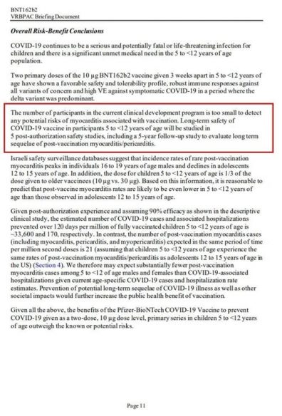 Tamo piše: „Broj sudionika u trenutačnom programu kliničkog razvoja premali je da bi se otkrilo sve potencijalne rizike od miokarditisa povezane s cijepljenjem. Dugoročna sigurnost cjepiva protiv COVIDA-19 proučavat će se kod sudionika u dobi od 5 do <12 godina sa 5 sigurnosnih studija nakon odobrenja, uključujući 5-godišnju studiju praćenja za dugoročnu procjenu posljedice miokarditisa/perikarditisa nakon cijepljenja.“