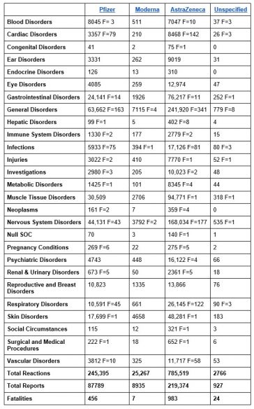 - Krvarenje (sve vrste) – 1.878 (Pfizer) + 4.261 (AZ) + 203 (Moderna) + 18 (nepoznato) = 6.360 [Vrste hemoragije – srčane, ušne, nadbubrežne, očne, želučane, usta, jezik, desni, crevne, mjesto ubrizgavanja, mozak, rane, stoma, bešika, bubreg, vagina, materica, krvarenje poslije menopauze, jajnici, penis, pluća, nos]