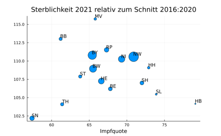 Prema ovoj brojci, Saska (SN) i Thuringia (TH) imaju najbolje rezultate u pogledu trenutnog viška smrtnosti. Oni također imaju najnižu stopu procijepljenosti.