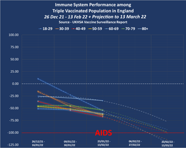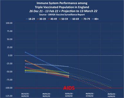 Međutim, trebalo je samo nekoliko tjedana da se stope među trostruko cijepljenima drastično povećaju u usporedbi sa stopama među trostruko cijepljenom populacijom, a analiza pokazuje da bi trostruko cijepljeni sada mogli razviti potpuni sindrom stečene imunodeficijencije već 13. ožujka 2022.