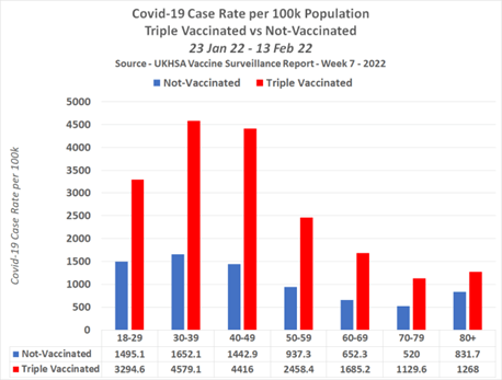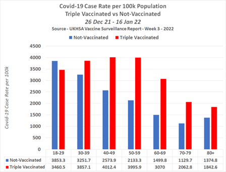 Sljedeći grafikon prikazuje stope slučajeva Covid-19 na 100.000 stanovnika među trostruko cijepljenima i necijepljenima u Engleskoj između 26. 21. prosinca i 16. siječnja 22. siječnja. Podaci su izvučeni iz Tablice 12 koja se nalazi na stranici 38 UKHSA Vaccine Surveillance Izvješće – 3. tjedan – 2022.