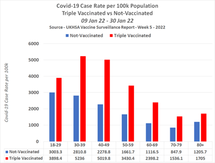 Sljedeći grafikon prikazuje stope slučajeva Covid-19 na 100.000 stanovnika među trostruko cijepljenima i necijepljenima u Engleskoj između 9., 22. siječnja i 30. siječnja 22. siječnja. Podaci su izvučeni iz Tablice 13 koja se nalazi na stranici 47 UKHSA Izvješća o nadzoru cjepiva – 5. tjedan – 2022.