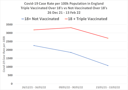 Sljedeći grafikon prikazuje stope slučajeva Covid-19 na 100.000 stanovnika među trostruko cijepljenima i necijepljenima u Engleskoj između 23. siječnja i 22. siječnja i 13. veljače 22. Podaci su izvučeni iz Tablice 13 koja se nalazi na stranici 44 UKHSA Vaccine Surveillance Izvješće – 7. tjedan – 2022.