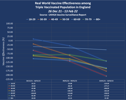 Jedini put kada se pokazalo da je djelotvornost cjepiva pozitivna među trostruko cijepljenima bio je između 26. 21. prosinca i 16. 22. siječnja u dobnoj skupini od 18 do 29 godina. Ali čak i tada ta pozitivna učinkovitostiznosi samo 10,19 %. U istom razdoblju svaka druga dobna skupina pokazala je negativnu učinkovitost cjepiva, a najniža je zabilježena među dobnom skupinom od 60 do 69 godina na minus 104,69 %.
