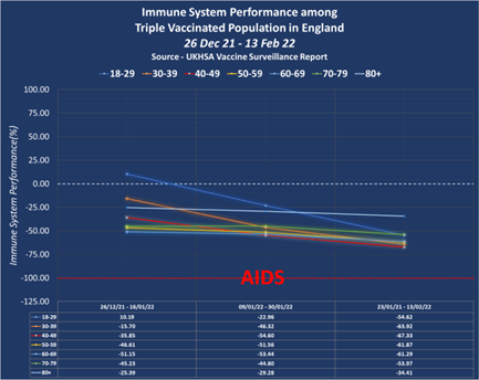 Ali osvrt na prethodne statistike pokazuje da se taj rizik povećava iz tjedna u tjedan, što ukazuje da injekcije Covid-19 oštećuju prirodni imunološki sustav, a analiza službenih podataka UKHSA snažno sugerira da je većina trostruko cijepljene populacije udaljena samo nekoliko tjedana od razvoja potpunog sindroma stečene imunodeficijencije (AIDS).