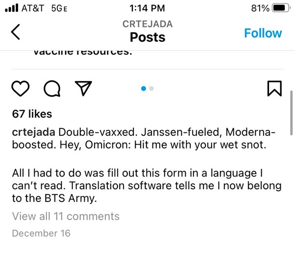 Samo dan prije toga, 17. prosinca, Carlos Tejada objavio je na Instagramu: “Dvostruko cijepljen. Pokrenut Janssenom, pojačan Modernom. Hej, Omicron: Udari me svojom mokrom njuškom.”