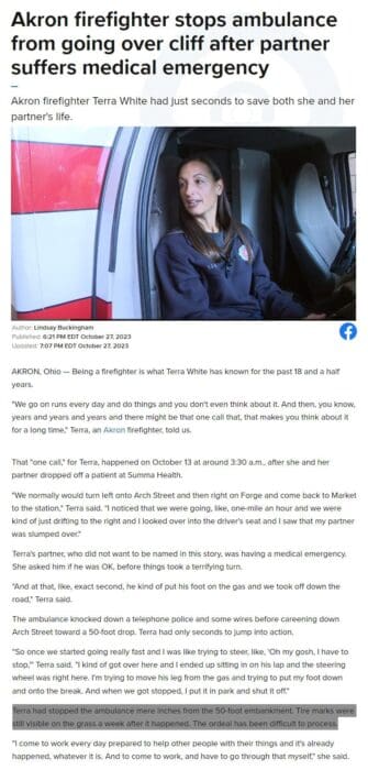 13. listopada 2023. u 3:30 ujutro, partner vatrogasca Terra White srušio se za upravljačem dok je vozio vozilo hitne pomoći i zamalo pao s litice. Sam videozapis možete pogledati u nastavku . U ovom članku predstaviti ćemo više primjera takvih nedavnih kolapsa za volanom zbog “iznenadnih zdravstvenih poteškoća”, koje je pretrpio vozač i kako su te priče završile.