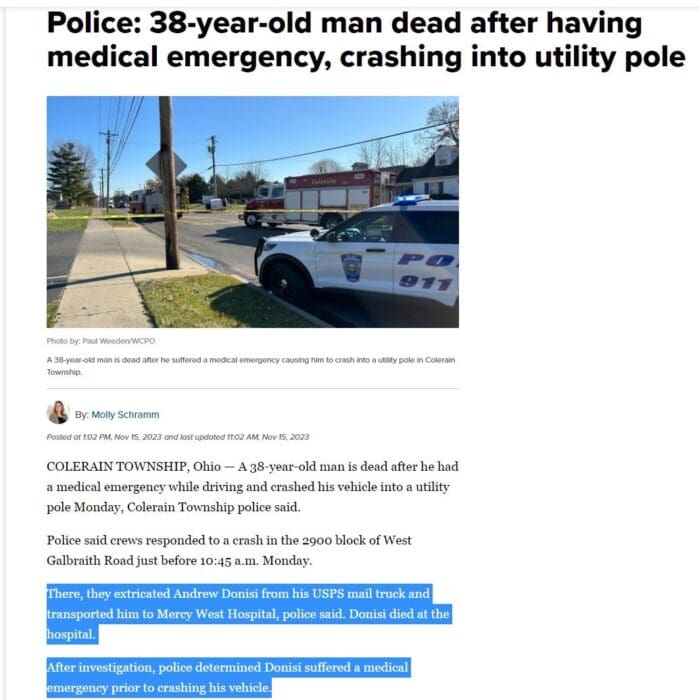 15. studenoga 2023., Ohio: 38-godišnji USPS vozač kamiona Andrew Donisi odazvao se na poziv za hitnu medicinsku pomoć, kada se tijekom vožnje zabio svojim vozilom u stup.